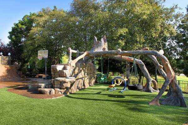 Если у вас случайно на участке имеется старое, требующее выкорчевывания, дерево, то его можно использовать в качестве базы для детской игровой площадки. Дети очень любят лазать по деревьям, таким образом можно развивать моторику рук, подобная площадка будет всегда востребована у вашего ребенка. Данную конструкцию можно использовать и как элемент более крупной площадки.