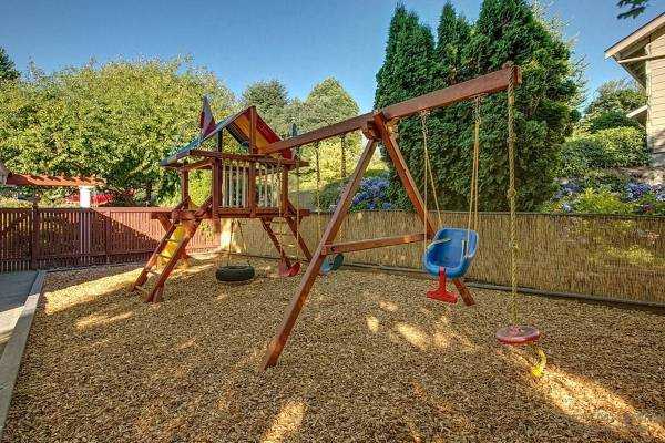 Немаловажным моментом является и уровень освещения игровой зоны – нельзя, чтобы дети находились в плохо освещенном месте или в тени. Вместе с этим на открытом участке, где длительное время светит солнце, оставлять их тоже не стоит! Как вариант, можно разместить одну треть площадки под солнцем, например, зону активных игр или бассейн, а оставшуюся часть в тени, где разместятся качели либо песочница.