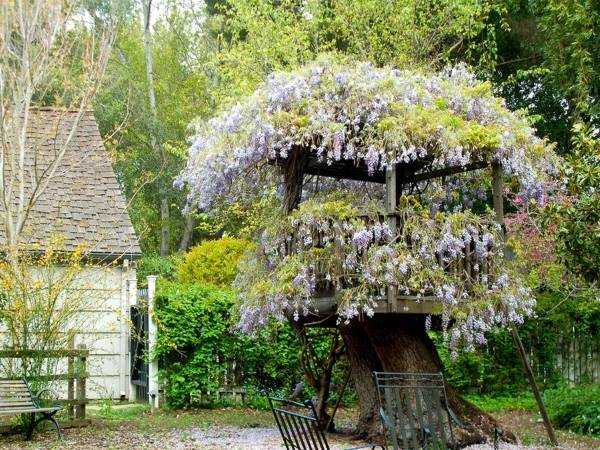 Еще одна интересная и креативная идея — детский домик на дереве. Даже взрослые с удовольствием посидели бы в таком домике, если, конечно, дети разрешат… Подобное сооружение можно сделать даже на старом плодовом дереве, либо на дереве рядом с участком, если поблизости от вас есть лес.