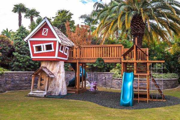 Эта детская площадка универсальна — в ней присутствует и домик для игр, и песочница, и лесенки, и сетка, и качели и много уровней, чтобы лазать. Одно такое строение на участке позволит занять ребенка на весь день, а ночью ваше сокровище будет спать без задних ног, наигравшись и набегавшись.