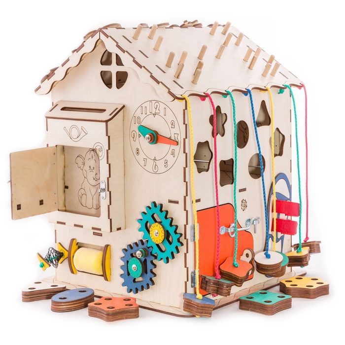Помимо классической развивающейся доски, можно поиграть с фантазией и смастерить домик бизиборд для девочек.