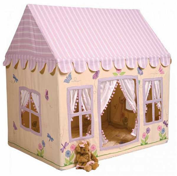 В последнем случае изделие изготавливается по типу магазинных детских игровых палаток. Для изготовления каркаса лучше всего использовать дерево — работу с этим материалом возьмут на себя отец или дедушка, а пошивом занавесок, проемов окон и дверей и самого домика — мама или бабушка.