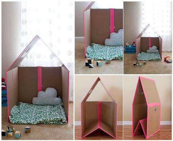 Поэтому лучше сделать для детей настоящий сюрприз. Собственный более прочный игровой домик в квартире, который можно сделать своими руками. В качестве материала для такого домика подойдёт плотный картон. Но как же его сделать? Всё очень просто, с картоном, ваша фантазия ничем не ограничена, ведь это настолько податливый материал, что строить домик можно прямо с детьми (так интереснее для всех). Вы можете, как самостоятельно придумать каркас домика, так и распечатать его в интернете. И все что понадобиться вам для строительства, это: ножницы, клей и картон. А если увлечься, то рядом можно построить домик и для, упомянутых выше, домашних любимцев.