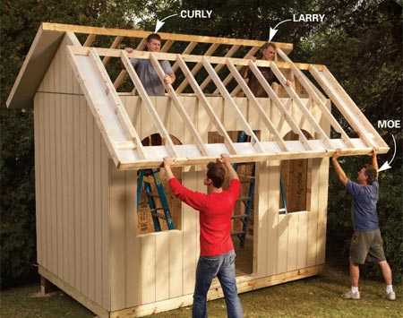- Положите пол и поднимите торцы. Используйте строительный угольник, чтобы проверить углы (все должны быть 90°), а затем подгоняйте крышу. Поднимите панели крыши на место