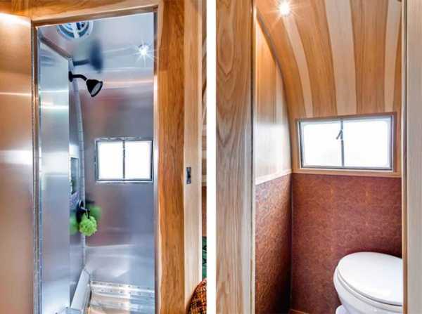 В санузле, отделенном от основной зоны перегородкой, монтируют умывальник, душевую кабину, портативный туалет, а также шкафчики и зеркала. Вода в сантехнические приборы подается при помощи насоса, который автоматически включается при открытии крана. Жидкости из душа и умывальника поступают в накопительный бак, емкость для стоков из туалета составляет до 24 л. Опорожнение этих баков предусмотрено снаружи.