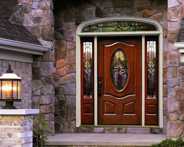 Деревянная входная дверь красиво сочетается с витражными вставками