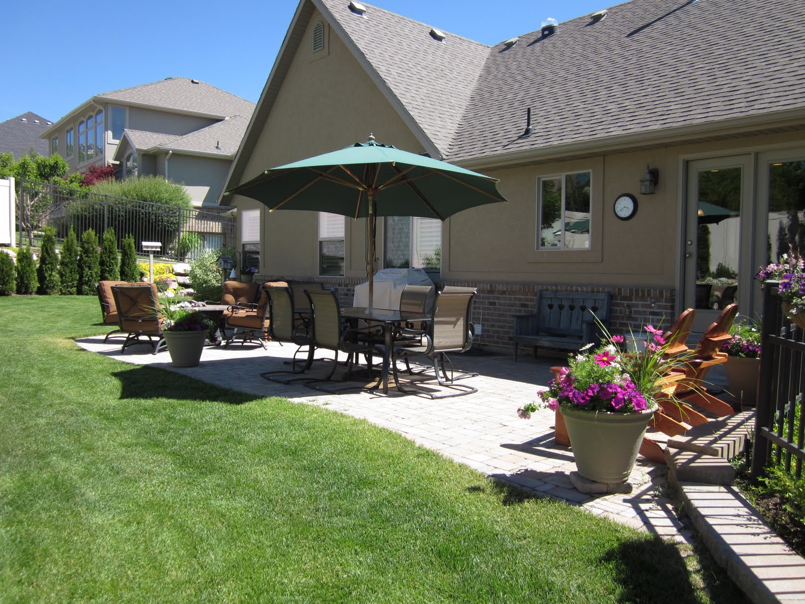 Дизайн частного двора с мощением плитамиМебель может быть и пластиковая. Ее можно быстренько собрать и освободить пространство.