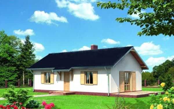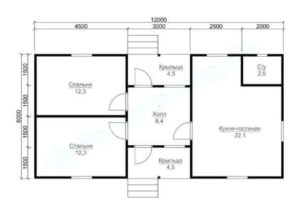Дом имеет 2 крыльца и входа посреди фасадов. Кухня совмещена с гостиной, размер помещения составляет 22,1 м2. Внутри 2 спальни по 12, 3 м2 каждая. Санузел имеет небольшие габариты– 2,5 м2. Однако в проекте его можно увеличить до 6 м2 за счёт площади гостиной. Высота потолков – 2,7 м.