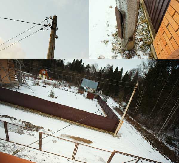 3. При однофазном вводе к каждому потребителю подключается два проводника: фазный и нулевой. На фото вы можете видеть старые алюминиевые провода на ближайшей к дому опоре. Отвод в дом уже сделан с помощью провода СИП. Особое внимание на тот факт, что все опоры воздушной линии должны иметь повторное заземление нулевого проводника (правое верхнее фото). Нужно это для того, чтобы исключить аварийные ситуации, как например «обрыв нуля». При этом следует с особым вниманием отнестись к своему собственному заземлению при отсутствии повторных заземлений на промежуточных опорах, иначе в аварийной ситуации ваше собственное заземление может оказаться единственным для всего поселка.