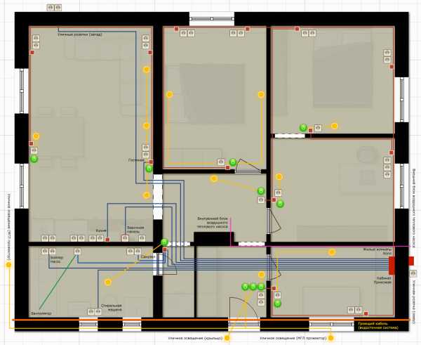 6. Переходим к внутренней проводке дома. Повторюсь, что при проектировании электрической сети использовался принцип разумной достаточности. Конечно можно было сделать в 2 раза больше розеток и на столько же увеличить количество силовых линий, но я считаю что в этом совершенно нет необходимости. Пояснения к схеме: красные квадраты — распределительные коробки, желтые круги — лампы. Синим обозначена проводка в стяжке, красным — в стенах. Везде в доме используется только светодиодное освещение (суммарное потребление всех включенных одновременно ламп не дотягивает и до 300 ватт). Освещение запитано от силовой линии на конкретную комнату, не вижу практической необходимости в разделении, к тому же это существенно увеличивает объем монтажных работ. На схеме отмечены все существующие в доме потребители. Если есть вопросы — спрашивайте.
