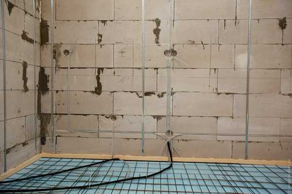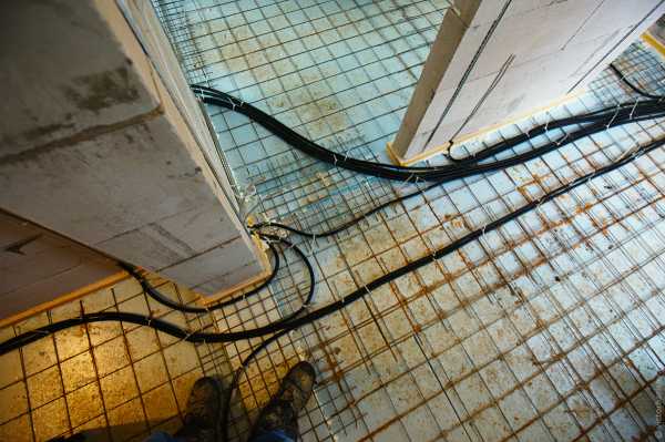 10. Напольная стяжка залита. Вопрос на каком этапе прокладывать кабель по стене — исключительно из ваших личных предпочтений. Кто-то сначала штукатурит стены, потом делает штробу, прокладывает кабель и заделывает штробу обратно. Я предпочитаю делать проводку до оштукатуривания стен. Этот способ может показаться неудобным т.к. потребуется повышенное внимание во время штукатурных работ к точкам с монтажными коробками (надо их чем-то заткнуть, а потом расковырять). Обратите внимание на левый угол — все коммутации на проходных линиях розеток сделаны не в подрозетниках, а в отдельных распределительных коробках.
