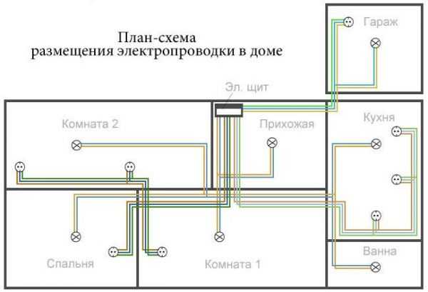 После того, как совершены расчеты сечения электрического кабеля, выбран способ прокладывания проводки, необходимо перейти к составлению схемы. Для этого удобно использовать план-схему дома. На схеме отмечается точное расположение всех элементов энергосети во всех помещениях: электрический щиток, электросчетчик, розетки и т.д.