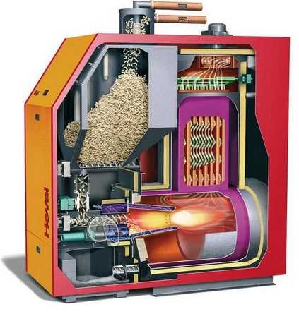 Самым ярким и экономичным представителем источников тепла на твердых видах топлива является энергосберегающий котел, сжигающий древесные гранулы – пеллеты. Среди своих «собратьев» он имеет наивысший показатель эффективности, его КПД декларируется на уровне 92%. В действительности эта величина может быть несколько меньше, но агрегат и вправду заслуживает внимания, поскольку использует возобновляемый источник энергии и выбрасывает в атмосферу минимальное количество вредных веществ.