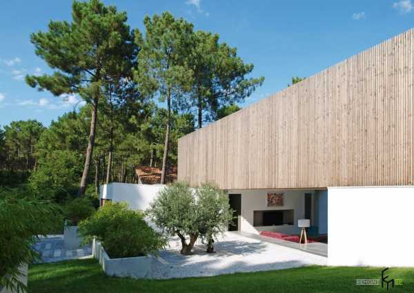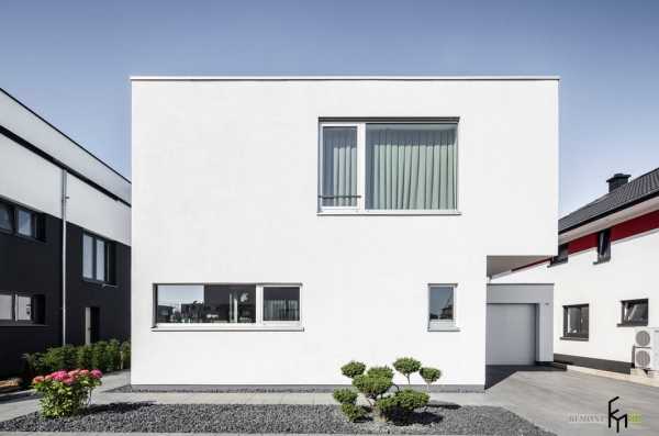 Для этого частного дома строгой геометрической формы был выбран совсем нестрогий вариант отделки. Верхний этаж как-будто окутан белоснежным кружевом. Яркий пример того, что минимализм необязательно должен быть скучным.