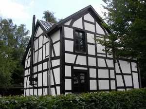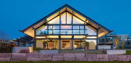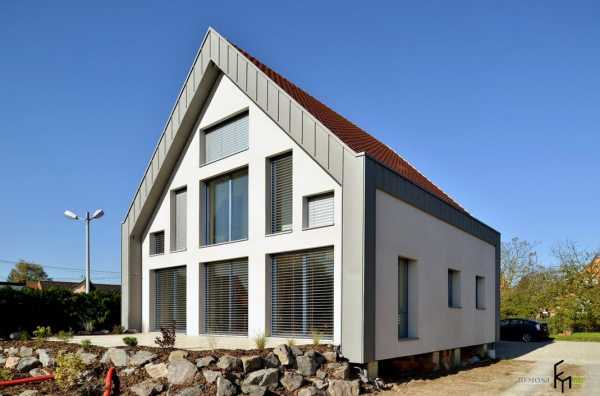 Например, этот современный частный дом гармонично сочетает присутствие классического, среднеевропейского и немецкого стиля фахверк. На это указывает не только конструкция здания, но способ отделки. Для придания уже готовому зданию стиля фахверк достаточно применить в отделке поверхностей темные деревянные балки, размещенные на светлом фоне. Этот вид обработки поверхностей достаточно экономичен и быстр в исполнении, но нужно быть готовым к тому, что каждые 15-17 лет балки нужно будет менять.