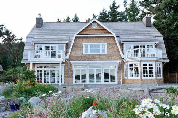Дерево на фасаде здания позволяет привнести в ландшафтный дизайн двора некоторую эклектичность, этническое настроение. Помимо этого, гонт и прочие виды подобного покрытия считаются экологически чистыми природными материалами, которые используются для строения безопасных домов.