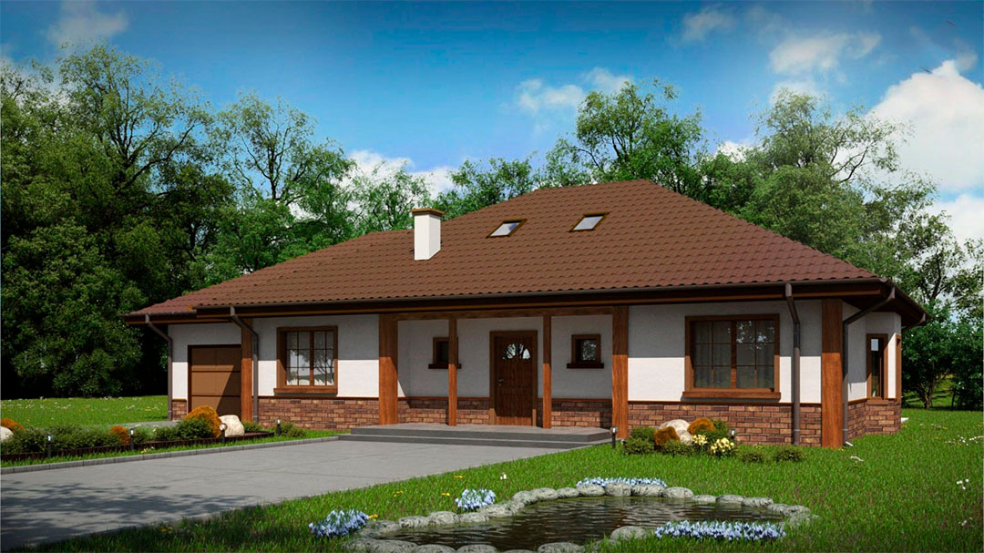 - Одноэтажные дома, выполненные с применением технологии «по-мокрому» и устройством декоративных панелей и искусственного камня или натурального камня или клинкерного кирпича.