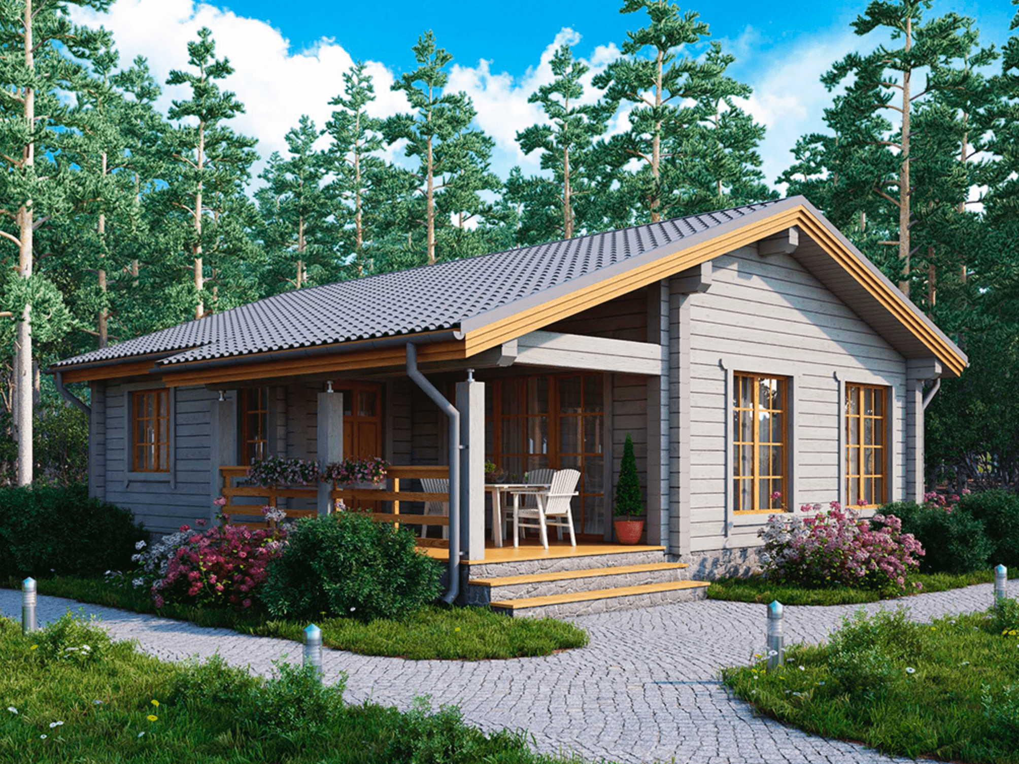 Финский одноэтажный дом с верандой – идеальное решение для загородного дома. Мансардный этаж, который образует крышу веранды, позволит с комфортом разместить всю семью, ведь спальня может располагаться на уютной пристройке. Сам дом имеет компактные размеры и поместится на участке даже самой маленькой площади.