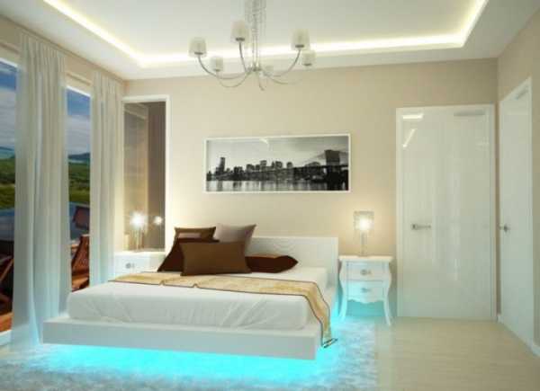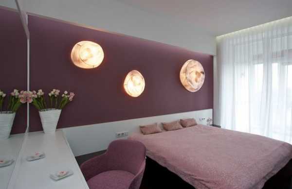 Точечное освещение может быть представлено светильниками над кроватью. Если в помещении есть ниши, разумно выделить их точечным светом. Можно дополнительно подсветить шкаф (например, светильниками внутри) или туалетный столик.
