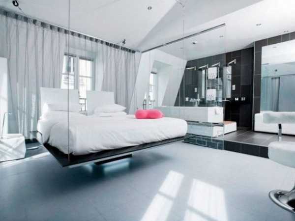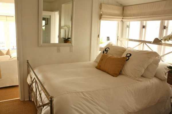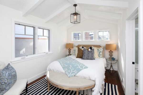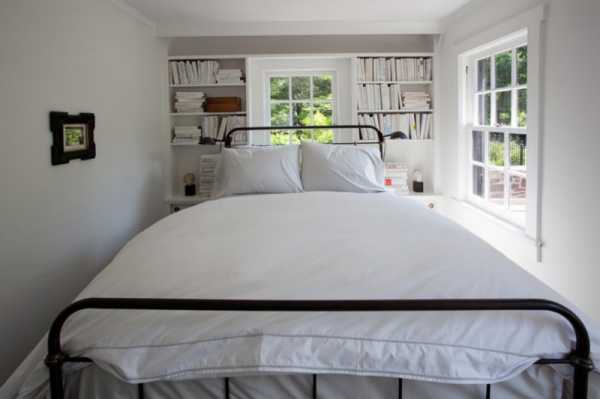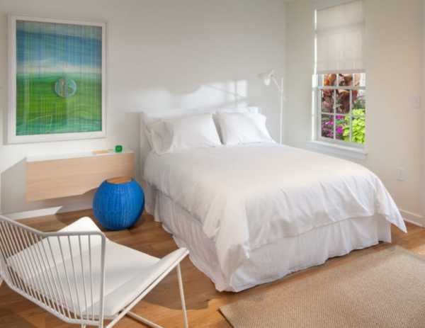 Современный дизайн маленькой спальни частного дома можно сделать таким, что комната станет визуально большой. Для этого надо: много света, отвлекающий внимание элемент и «холодная» светлая цветовая гамма.