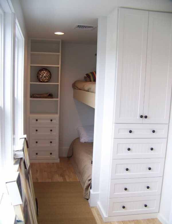 Одежду удобно хранить в специальном шкафу. В целях сохранения места сделайте встраиваемую мебель.