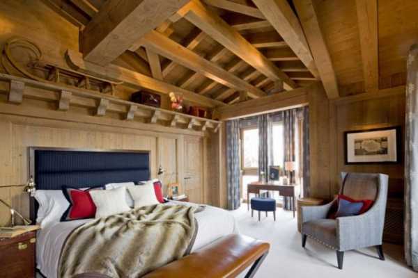 Великолепно смотрится интерьер спальни загородного дома с обилием деревянной отделки. Роскошные панели и мебель из ценных пород дерева, бронзовые аксессуары и декор – это атрибуты по-настоящему королевской загородной резиденции. Но в этом случае для таких решений нужен большой объем и размах.