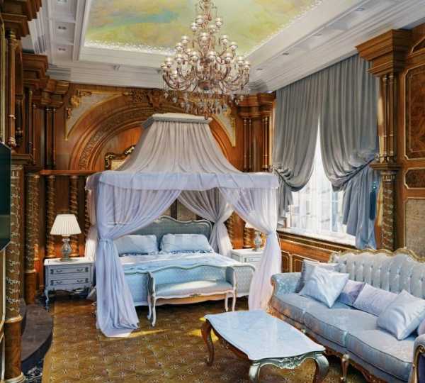 Самое краткое описание классического стиля можно выразить двумя словами – роскошь и комфорт. Высокие потолки, обилие декора, богатая отделка, художественный паркет, мебель стоящая на изогнутых «львиных лапах», кровать под балдахином – все это признаки одного из дворцовых стилей. А если загородный дом построен как дворец, то и спальня должна выглядеть подобающим образом.