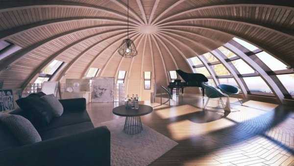 Планировка купольного дома имеет ряд отличий от привычной нам прямоугольной конструкции. Однако это нисколько не ограничивает владельцев дома в выборе дизайна помещения. Даже наоборот, необычный облик помещения позволяет воплотить в жизнь самые неординарные решения интерьера.