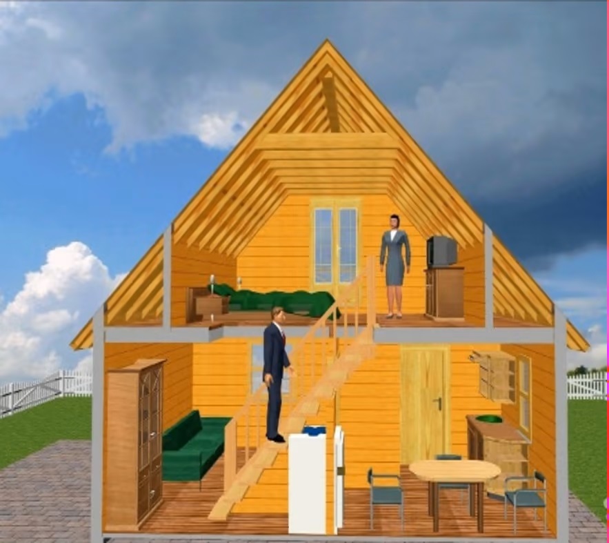 Гостиная комната предлагаемого к рассмотрению дома совмещена с кухней или имеет отделяющую легкую перегородку. Отдельное помещение под подсобку. Маленькая душевая комната и туалет, а также две спальни небольшого размера. За счет максимального застекления гостиной проблема с освещением решается просто. Небольшой холл, из которого правая дверь ведет в смежные спальни, а левая – в душевую комнату. Дверь, расположенная прямо перед глазами, открывает вход в гостиную, из которой есть выход на кухню. С левой стороны лестница на второй этаж, расположенная рядом со входом в гостиную; - мансарда. Планировка дополнительной надстройки предусматривает наличие ванной достаточно больших размеров, а также двух спален и небольшой комнаты для релакса.