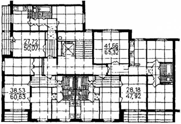 Пяти ярусные дома панельного типа с четырьмя квартирами на одной площадке.