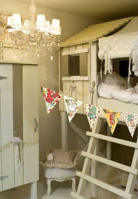 Вот яркий образец в виде голубятни. Наверху – спальное место, внизу – полки для книг и разных мелочей, а также «загон» для больших ездовых игрушек.Нежный гламурный вариант для девочки.