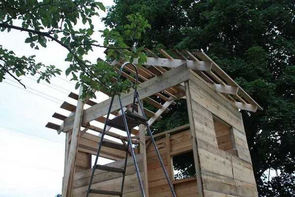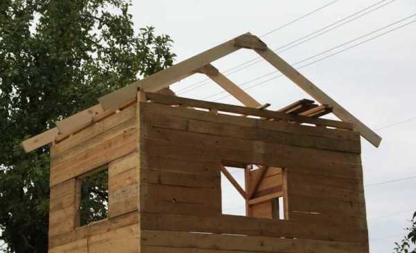 Соорудите каркас для крыши, прикрепите его к стенам будущего домика и оббейте досками. Теперь нужно покрасить конструкцию лакокрасочными материалами, чтобы обеспечить защиту от заноз.