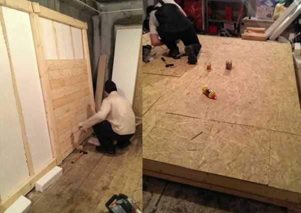 Пол будет утеплен пенопластом. Дети любят сидеть на полу, потому утепляем хорошо — пенопластом в 100 мм. Под него с нижней стороны набиваем тонкие планки — чтобы не проваливался. Вставляем пенопласт. Щели можно заполнить монтажной пеной.