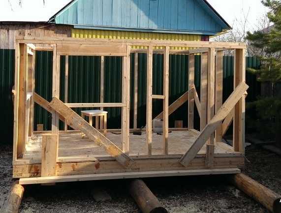 Строительство из бруса предполагает изготовление каркаса, который затем обивают досками с учетом проема для входной двери и окон.