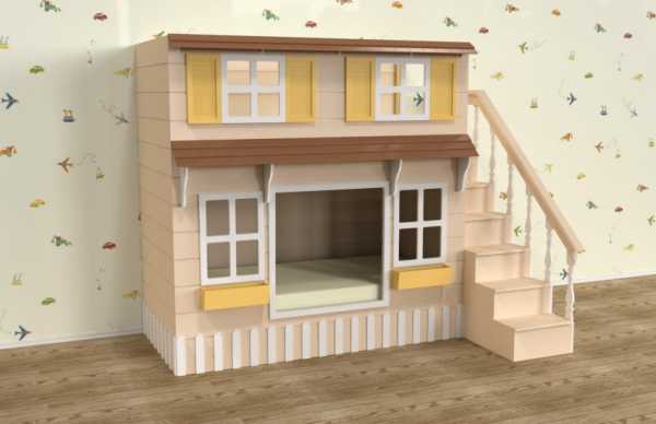 Представитель минималистского стиля, который открывает хороший обзор. Домик с верхним этажом – спортивной площадкой, нижним – местом для отдыха. Уютный домик с постелью для маленькой принцессы.