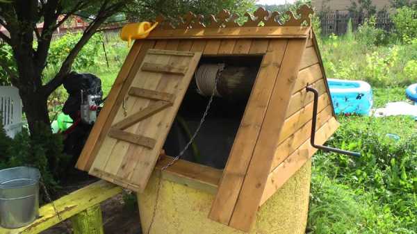 Колодезный домик выполняет ещё одну функцию — защищает от постороннего проникновения, ну как минимум он закрывается от детей. Врезают или вешают навесной замок, устанавливают щеколду.