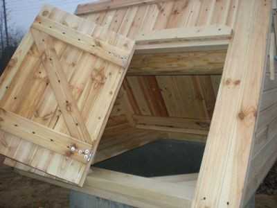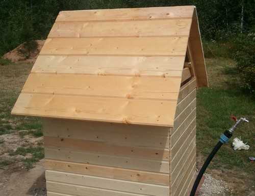 Последняя в очереди — отделка. Обшиваем шалёвкой или вагонкой, и перекрываем кровельным материалом. Вот тут, доски не самый подходящий материал для перекрытия. Если перекрыть сырыми досками, они со временем высохнут и образуются щели — осадки будут попадать в колодец. Перекрыть сухими досками, то они от влаги будут разбухать и коробить крышу, что тоже чревато протеканием воды.