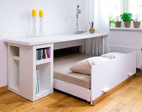 Нередко можно встретить кровати, выезжающие из подиума, на котором можно установить небольшой столик. Интересны также кровати, спрятанные в шкафах.