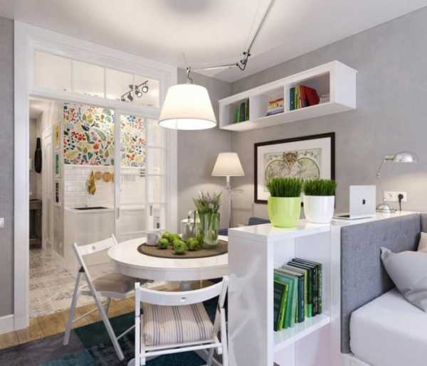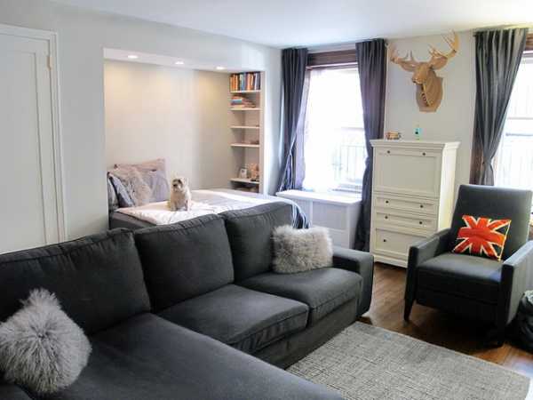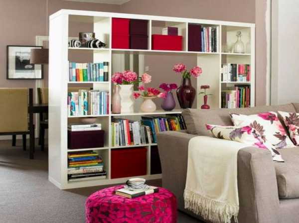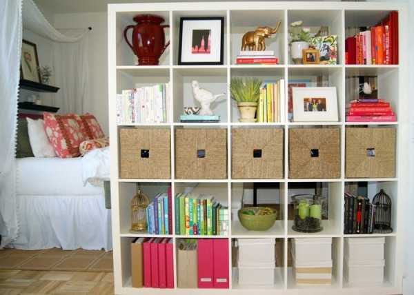 Самым простым способом разделить комнату на зоны, является установка стеллажей. С их помощью вы без труда разграничите жилую зону и зону отдыха так, чтобы возникло ощущение двух разных комнат. Сам стеллаж в свою очередь послужит для украшения помещения и хранения нужных вещей.