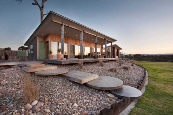 Из тонких нюансов состоит общая концепция красивой дачи — на фото мы видим вариант обустройства ступеней. Вместо простого бетона нижняя ступенька декорирована галькой.