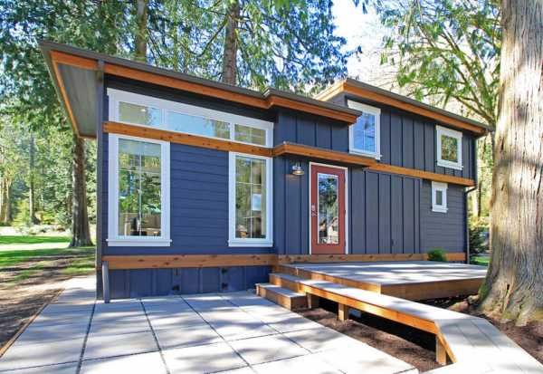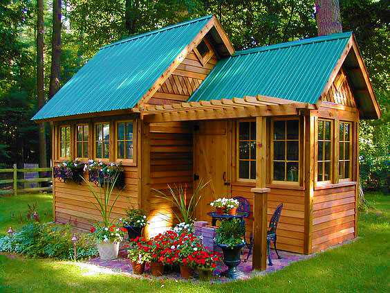 Не будем долго и нудно рассуждать, а сразу же приступим к просмотру и вот вам идея — небольшой красивый деревянный домик под крышей из металлопрофиля. Веранда выполнена в виде более маленькой пристройки, перед входом на веранду оборудовано мощеное патио и расставлены цветы в кадках.