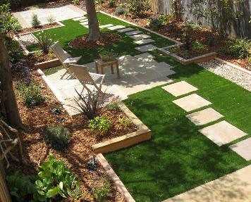Пример оформления небольшого дачного участка в геометрическом дизайне. Дорожки выполнены из плиток квадратов, клумбы по периметру, газон и патио для отдыха под тенью большого дерева.