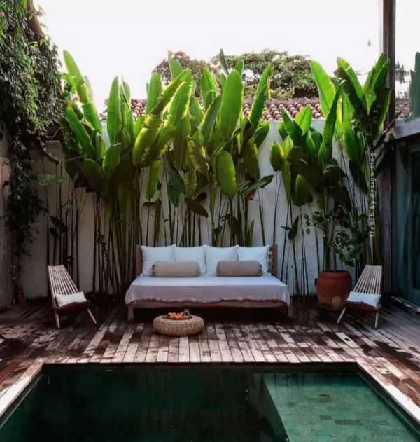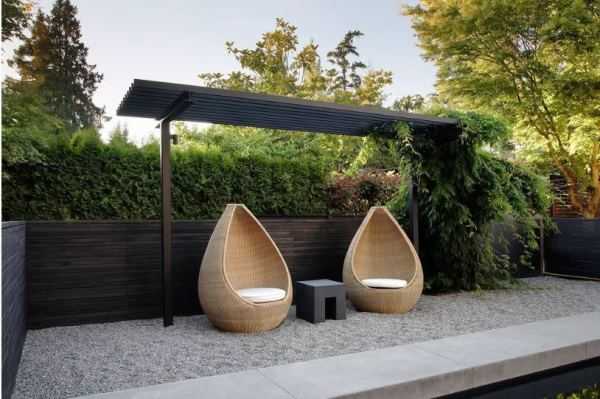 Также весьма популярным в зоне отдыха стало наличие декоративного очага, камина или азиатской печи тандыр. Мебель, как уже упоминалось, должна соответствовать определенному стилю и быть практичной и комфортной. Наиболее удобной и практичной будет складная и легкая мебель, которая без особых трудностей будет собираться и храниться в помещении в холодное время года. Одной из наиболее востребованной, является мебель из пластика или ротанга. Также хороши изделия из бамбука, кованного метала и дерева.