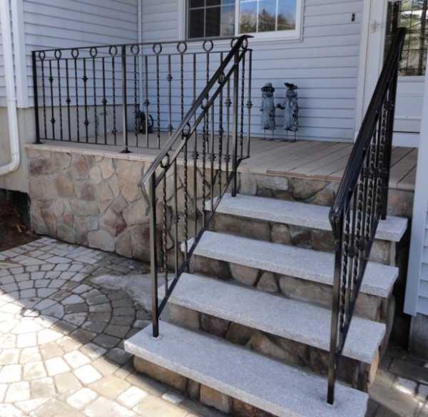 Однако, исходя из выбранных для крылечной конструкции материалов и стилистики, перила оформляются самыми различными способами. Так для крылечной пристройки, сконструированной из кованного металлического материала целесообразно изготовить и металлические перила.