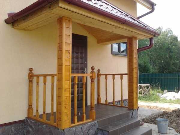 - Навес или козырек выполняет функции защиты крыльца от солнечных лучей и осадков. Элемент может выполняться в виде мини-крыши, иметь один скат или закругленный навес.