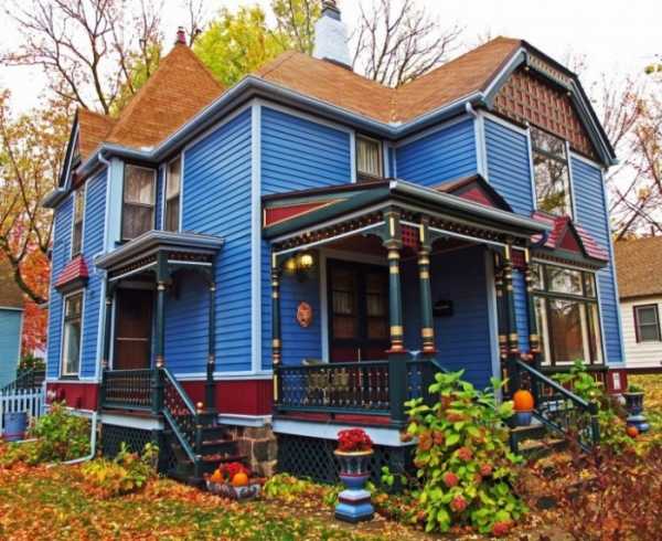 Дома в стиле кантри вместе с пристроенными крылечками имеют в своем оформлении много деревянных декоративных деталей в виде массивных колонн, украшенных декоративной резьбой.