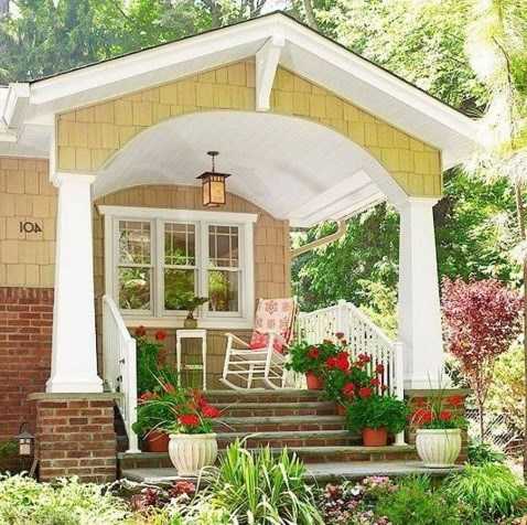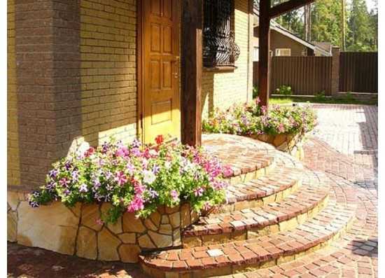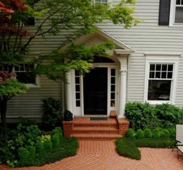 - Главное правило – это отсутствие больших насаждений у входа в дом. Ведь высокорослые растения скроют всю красоту крыльца.