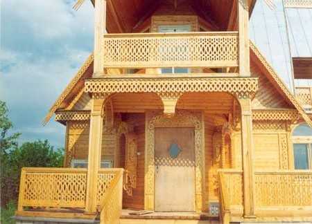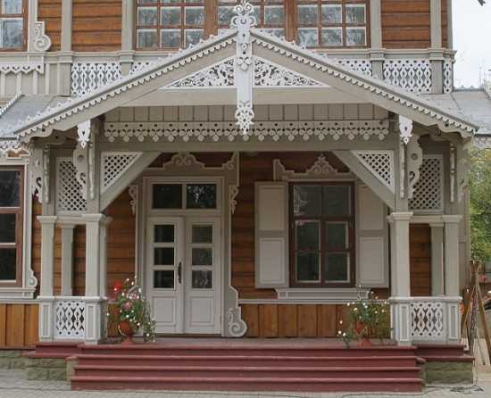 Еще одним вариантом украшения деревянного дома в русском стиле является резьба по дереву. Этот способ самый характерный для оформления русских домов. Подобное украшение крыльца подойдет не только для декорирования бревенчатого дома, но и отлично будет смотреться в сочетании с камнем или кирпичом. Можно купить сразу готовые резные элементы для украшения крыльца, которые делают на специальных заводах. Но есть умельцы, которые изготовят резное крыльцо по индивидуальному заказу, учитывая все предпочтения и пожелания заказчика.