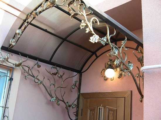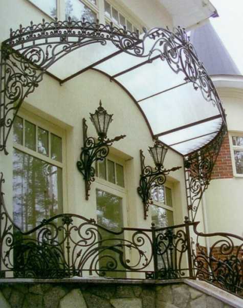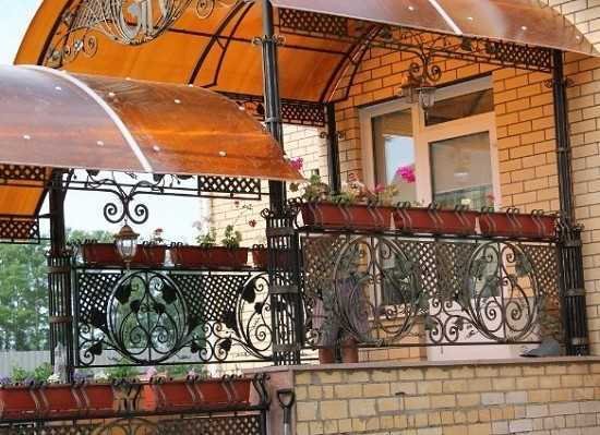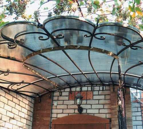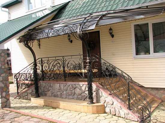 - Металл. Из этого материала возводятся каркас площадки, опоры козырька. Металлические части прочны и устойчивы, но некоторые металлы подвержены коррозии. Кованые элементы смотрятся изящно, дополняют роскошные экстерьеры частных домов.