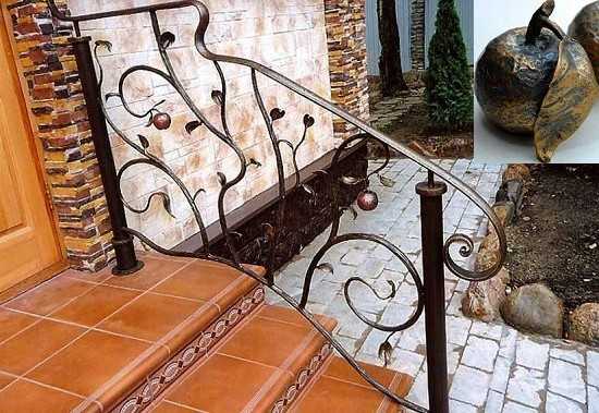Кованые изделия в декоре крыльца частного дома могут стать настоящим произведением искусства. Ведь хороший мастер на 2 метрах перил разместит настоящую кованую картину. При желании проект крыльца можно разработать самостоятельно, или использовать уже готовый вариант, предоставленный мастером. Подобным образом украшают не только перила, но делают массивный каркас крыльца с крышей из поликарбоната. Такой декор крыльца лучше всего подойдет для кирпичного или каменного коттеджа.